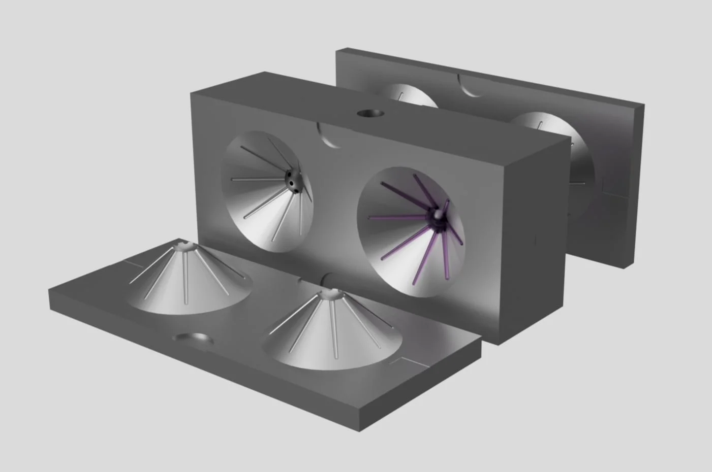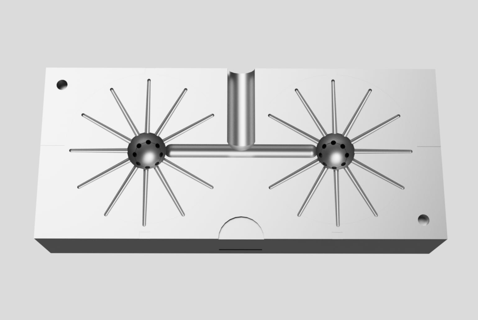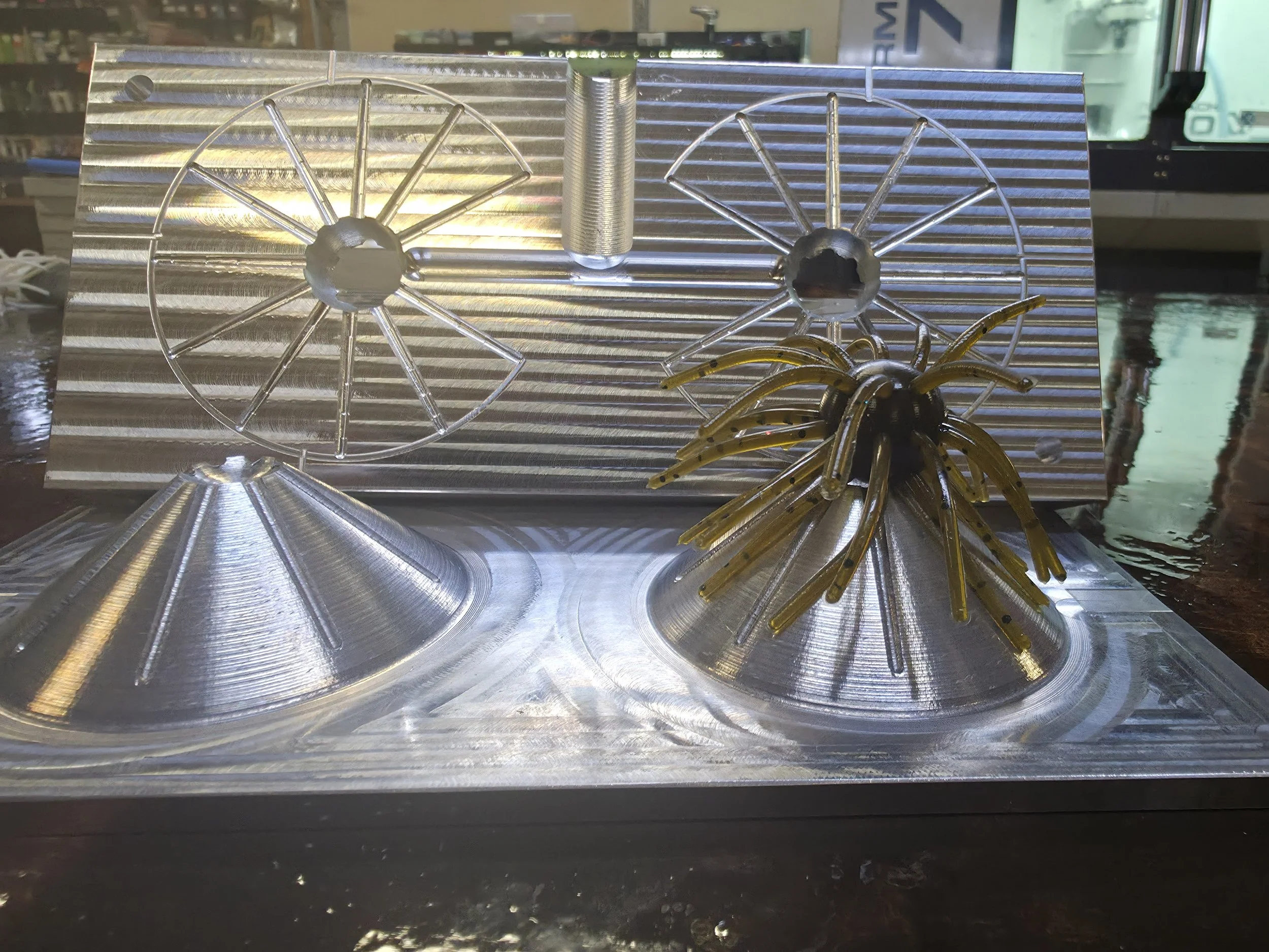 This 2 cavity mold is machined out of 6061 aluminum. Total bait diameter of 3.5” with a center ball size of 7/8” or 22mm. It has 27 tentacles per bait. The 4 piece mold measures 9"x4”×3.15” and weighs around 10.5 lbs.